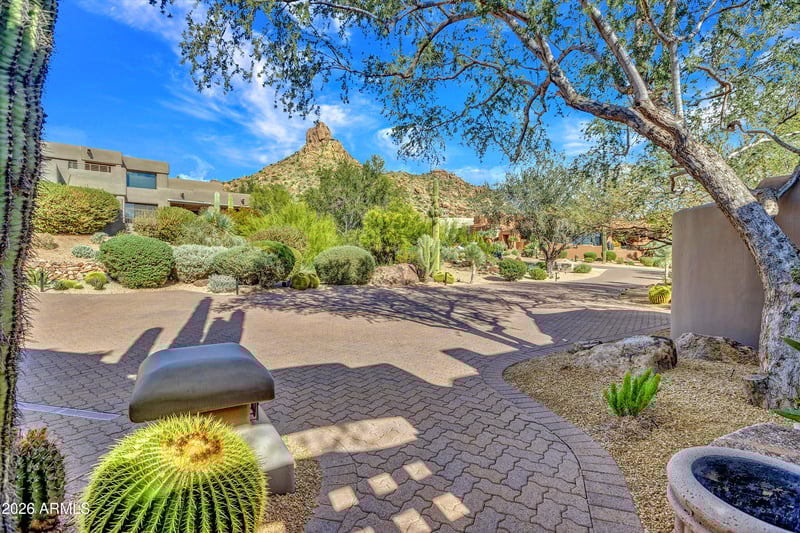 Listing details for 10040 Happy Valley Rd #1017, Scottsdale, AZ 85255 : IMMEDIATE GOLF MEMERSHIP AT CLOSE OF ESCROW. Situated in the exclusive enclave of the Hillside Villa Estates at Desert Highlands, this beautiful design by Lash McDaniel with NO INTERIOR STEPS is the epitome of casual elegance. Birds-eye views of the city lights, mountains including Pinnacle Peak, sunrise and sunsets, all surrounded by open space extending your privacy and views! A split floor plan includes master suite, 2 guest bedrooms each with ensuite baths, office + powder room. Convenient kitchen open to the breakfast room with the majestic mountain range as a backdrop! The two tiered backyard, designed to enjoy the beauty of the Sonoran Desert, includes a sparkling pool and spa, outdoor dining & built-in BBQ. Desert Highlands info... Designated a top 'Platinum Club of America'' golf club, Desert Highlands amenities include a Jack Nicklaus Signature championship golf course, 18-hole putting course, award winning clubhouse featuring ''Jacks'' gastropub, state of the art fitness center, Highlands Racquet Club featuring grass, clay & pickleball courts,& more. A $ 205,000 membership fee is due from buyer at close of escrow