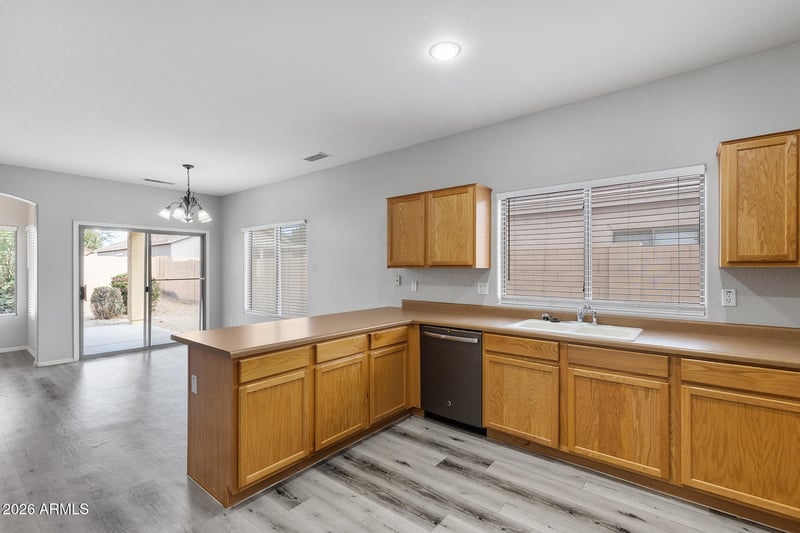 Enjoy an open floor plan with a seamless flow, featuring wood-look plank flooring complemented by plush carpet for a warm, welcoming feel. The kitchen offers abundant cabinetry and generous counter space.