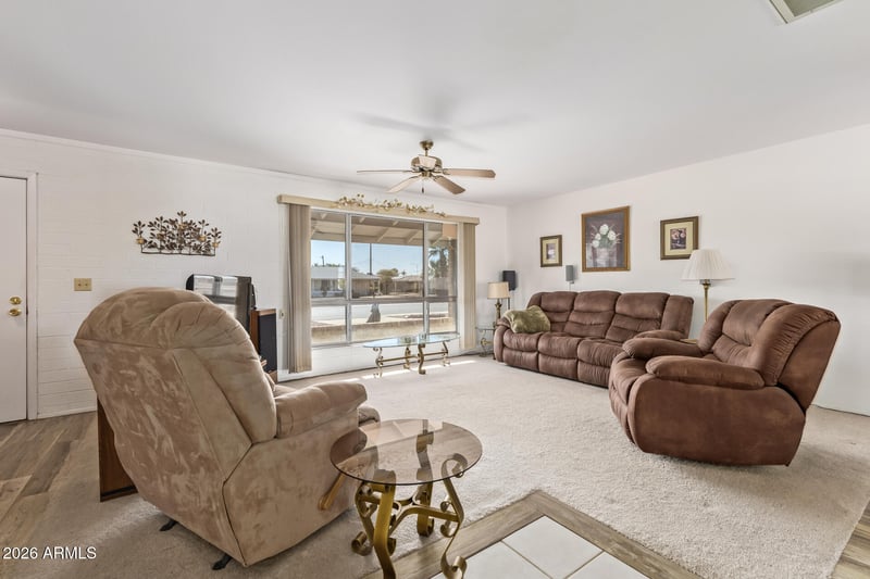 Listing details for 10230 Sun City Blvd, Sun City, AZ 85351 : Golf course living at its finest with stunning long views of the 13th fairway. This home features a desirable great-room layout where the kitchen, dining, and family rooms flow seamlessly—ideal for entertaining or relaxed everyday living. The spacious Arizona room offers additional living space and overlooks the 13th tee, creating the perfect spot to unwind. The north-facing backyard includes a covered patio and movable hot tub, ideal for enjoying Arizona's beautiful winter evenings. The large primary suite easily accommodates a sitting area, while the generous guest room is perfect for visiting friends or family. Oversized 1- car garage has room for a golf cart and extra storage. The home has been lightly used as a winter home for the last 19 years. Has a transferable appliance warranty.
