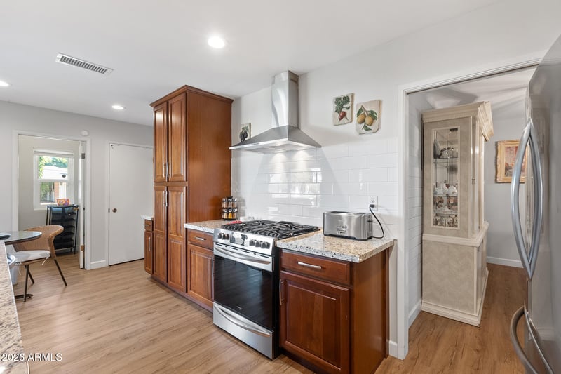 The renovated kitchen is both functional and beautiful, showcasing granite countertops, spacious cabinetry, a gas range, a modern, stylish vent hood, and stainless steel appliances—perfect for everyday cooking and entertaining. The updated bathroom features a beautiful vanity and quality finishes that elevate the space. One of the home's standout features is the huge Arizona room, ideal for enjoying Arizona's glorious weather, relaxing year-round, or creating a versatile bonus living space.