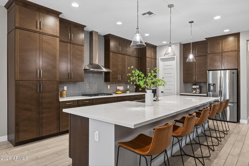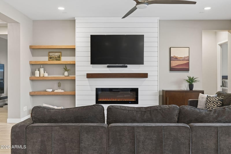Listing details for 10237 Seismic Ave, Mesa, AZ 85212 : From the moment you arrive, this stunning 3 bedroom plus den, 2.5 bath home makes an impression with artificial turf, stone accents, paver-lined walkways, and the added bonus of owned solar for energy efficiency. Step inside to wood plank tile flooring, two toned paint, and crisp white wood shutters throughout, creating a bright and welcoming feel. The living room is a true showstopper with a floor to ceiling shiplapped electric fireplace, built-in shelving, surround sound, and expansive views of the backyard through a 12 foot sliding glass door. The gourmet kitchen is designed to impress with a massive island, cabinetry extending to the ceiling, a single apron sink, tiled backsplash, modern pendant lighting, and a spacious walk-in pantry perfect for everyday living and entertaining. The primary suite is generously sized and finished with plush berber carpet. The spa-inspired bathroom features dual vanities with abundant drawer storage, an additional vanity area, a stunning super shower with rainfall shower head, and an oversized walk-in closet. The secondary bedrooms also offer berber carpet and share a beautifully appointed bathroom with dual vanities, with one bedroom featuring its own walk in closet. Even the powder bath stands out with an upgraded vanity and granite countertops. A custom drop zone near the garage adds both style and function with ample cabinetry, drawers, and a dedicated charging station. The backyard is truly a private paradise. Enjoy a pergola with integrated lighting, a luxurious heated pool with a massive baja step, water features, and a spa. Desert landscaping and strategically placed landscape lighting enhance the tranquil, spa-like atmosphere, making this space perfect for both entertaining and unwinding. Located in the award-winning Eastmark community, residents enjoy resort style amenities including pools, splash pads, neighborhood parks, Steadfast Farm, and The Mark clubhouse which hosts year round events and activities. This home perfectly blends luxury, comfort, and the Eastmark lifestyle. Don't miss your opportunity to make this exceptional property yours.