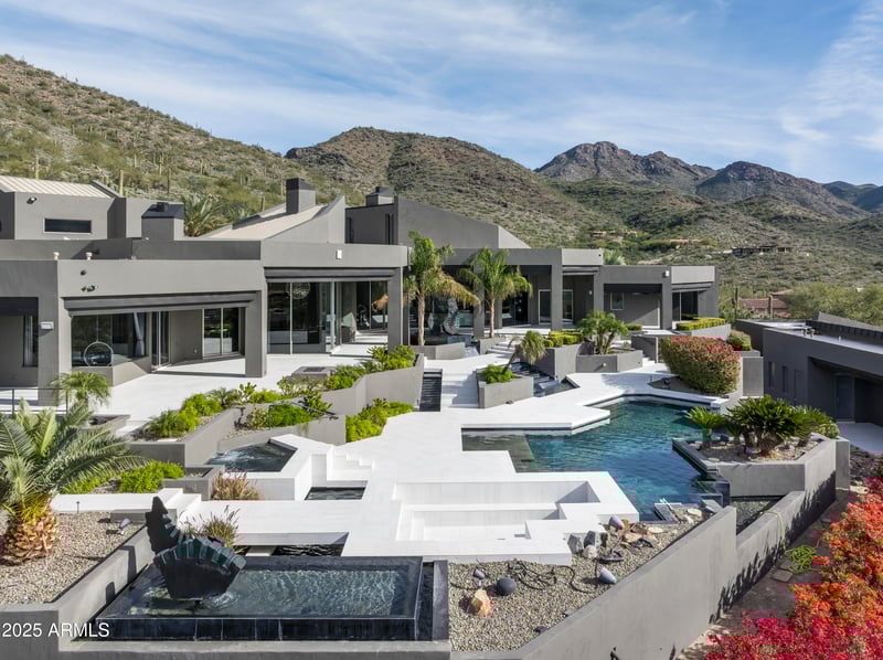 Listing details for 10324 Calle De Las Brisas --, Scottsdale, AZ 85255 : Rising above the desert on more than 4.6 gated acres in Scottsdale's prestigious Canyon Heights, this contemporary estate delivers a rare blend of architectural drama, privacy, and panoramic mountain and city-light views—set on your own private mountain. Positioned at the end of a quiet cul-de-sac, the approach unfolds along a private drive that leads to nearly 9,700 square feet of refined living space, complemented by a detached guest residence for added flexibility.