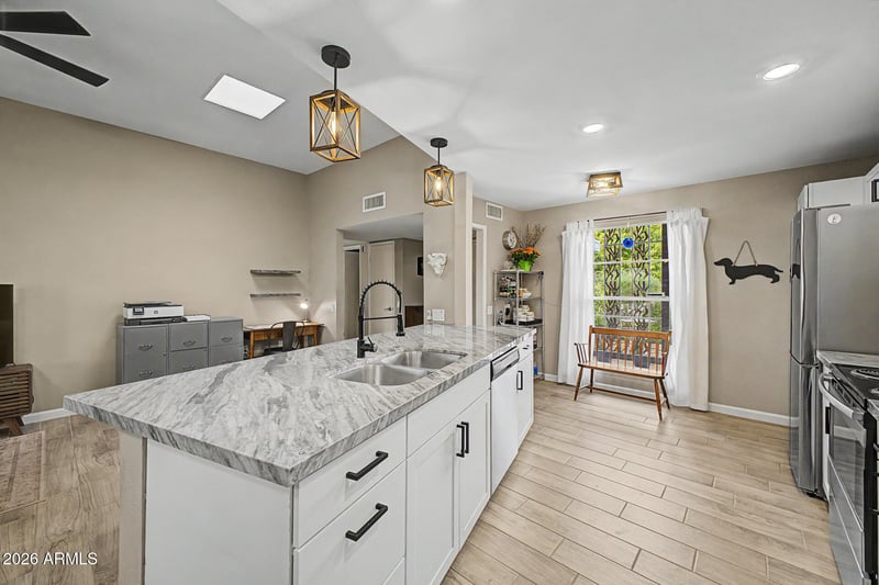 Listing details for 10333 Highwood Ln, Sun City, AZ 85373 : Immaculate and model-sharp! Step into this beautifully remodeled home through a stylish covered courtyard that sets the stage for an inviting light and open floorplan. The spacious kitchen boasts a large breakfast bar, granite countertops, subway tile backsplash, crisp white cabinetry, and stainless-steel appliances--perfect for entertaining or casual dining. Both baths feature updated vanities and custom tile surrounds, creating a modern, spa-like feel. This full remodel includes elegant plank tile flooring, designer 2-tone paint, 10-foot ceilings, upgraded indoor and outdoor light fixtures, ceiling fans & skylights that fill the space with natural light. A charming Arizona room/enclosed patio offers peaceful views of the lush, grassy backyard surrounded by mature thoughtfully... maintained landscaping including mature fruit trees. Large laundry room with built-in cabinetry & counter space. Located in the heart of Sun City--Arizona's original premier active adult community--this residence is part of an exceptional neighborhood designed for living life to the fullest. Sun City offers 7 recreation centers, 8 professionally maintained golf courses, 2 bowling centers, and over 130 clubs and interest groups, giving residents endless opportunities for social connection and recreation. Amenities include multiple pools and spas, state-of-the-art fitness centers, tennis and pickleball courts, walking and biking paths, arts and crafts studios, and on-site restaurants. With year-round activities, scenic surroundings, and a welcoming atmosphere, Sun City provides an unparalleled blend of comfort, convenience, and active lifestyle living. Additional upgrades are included in the attachment. HVAC and roof approx 8 years old. HOA covers painting of the exterior (about every 10 years), water, sewer, trash, lawn, tree & shrub trimming (not fruit trees).