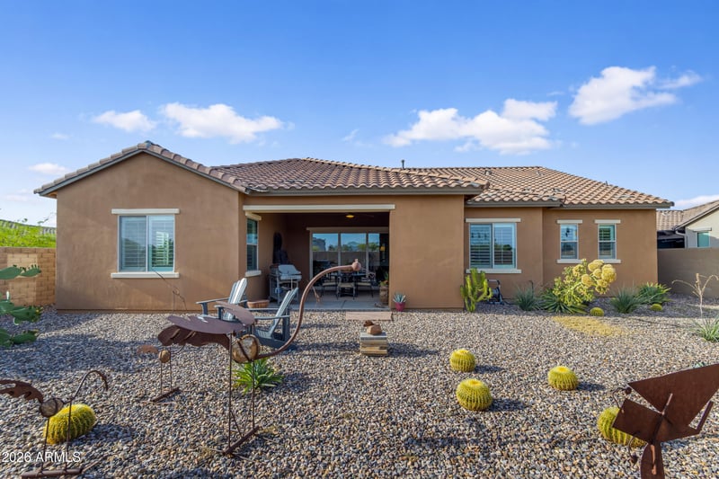 Listing details for 10351 Texas Ave, Mesa, AZ 85212 : Experience the finest in living in this stunning, upgrade-rich home located in Encore at Eastmark, a premier 55+ community. Imported tile flooring creates a seamless flow throughout. The modern kitchen features dark honed granite countertops, a six burner gas cooktop, stainless steel vent with custom tile surround, and gorgeous cabinets that extend to 10-ft ceilings. A 12-ft sliding glass door fills the spacious great room with natural light and blends indoor-outdoor living. The primary suite offers a spa-like bath with soaking tub, custom tiled shower, and separate water closet. The large, private lot showcases low-maintenance desert landscaping, allowing you to fully enjoy Encore's amenities, including a café, newly redesigned pool, outdoor sports, and many exciting activities.
