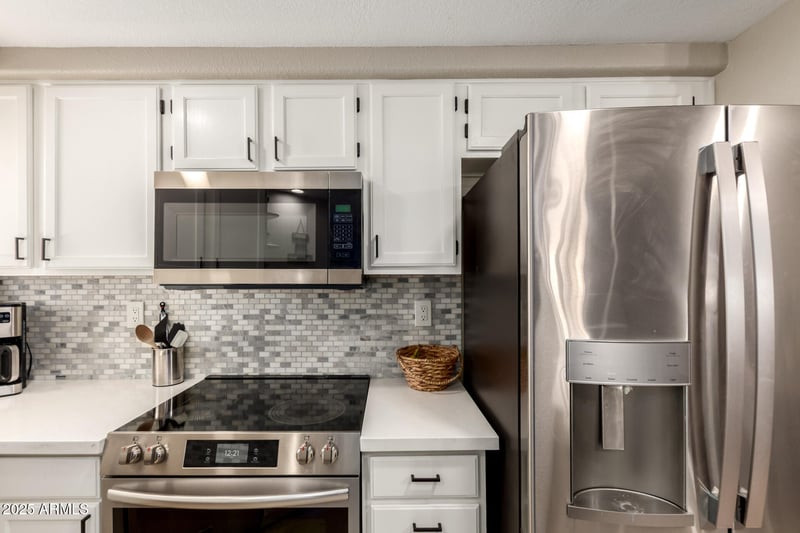 Listing details for 10410 Cave Creek Rd #1082, Phoenix, AZ 85020 : Discover all the charm of this lovely 2-bedroom condo near North Mountain preserve and hiking trails! Gated community with all appliances included, and no interior steps! Inside, you'll find a bright and inviting layout with wood-look flooring, sliding doors to the patio, contemporary lighting, and neutral tones throughout. The impeccable kitchen boasts ample cabinetry, tile backsplash, quartz countertops, and stainless steel essentials. Get a good night's sleep in the main suite, offering a private exit, a full ensuite with dual sinks, and a closet. Enjoy your morning brew under the cozy covered patio, and don't forget to visit the community's pool and spa for a relaxing time! Ideal for those seeking comfortable and easy-maintenance living, with gorgeous mountain views! Welcome home!