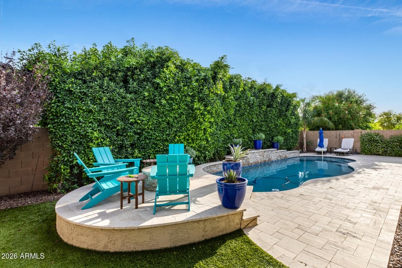 Kitchen features an island for everyone to gather, gas range, & butler's pantry. A dramatic slider door spans the back of the home, creating seamless indoor-outdoor views of the dreamy private backyard. The private primary suite features a large walk-in closet and plenty of room to relax, while the office with double glass doors and a closet easily functions as the home's 4th bedroom Step outside and unwind in your private backyard oasis, where stunning sunsets paint the sky over a beautifully landscaped retreat featuring travertine pavers, lush greenery, a cocktail fruit tree, a sparkling pool, and a cozy gas fire pit- perfect for relaxing evenings. This home is nestled in the friendly neighborhood of Mulberry, offering the ideal blend of community and convenience. Enjoy beautiful parks with lush green spaces, a community pool, basketball courts, pickleball, and engaging monthly events. With top-rated schools and a peaceful atmosphere, Mulberry is just minutes from shopping, dining, and everyday essentials