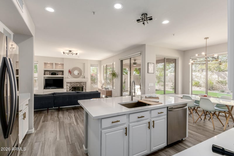 Tucked away on a quiet cul-de-sac lot, this beautifully updated 4-bedroom home plus dedicated office offers the perfect blend of timeless style and everyday comfort. Soaring vaulted ceilings and an abundance of windows flood the home with natural light, creating a bright, open feel from the moment you step inside. Designed with both elegance and durability in mind, the home features timeless wood-look tile throughout in the perfect, versatile color tone—bringing warmth, cohesion, and easy maintenance to every space. The thoughtfully refreshed interior showcases light, modern finishes that feel both current and classic, including stunning light quartz surfaces, updated light fixtures, and a soft neutral palette.