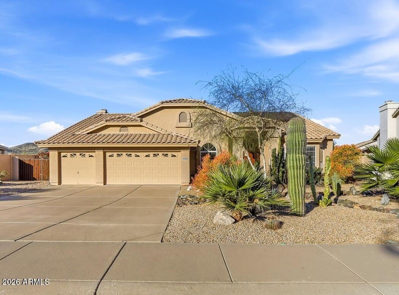Listing details for 10722 Coolwater Dr, Goodyear, AZ 85338 : A Botanical Masterpiece Backing to Estrella's Twin Lakes. Set on a premium over-sized lot near Estrella's most celebrated amenities, this exceptional pool home offers panoramic views. Enjoy breathtaking lake and garden views from beneath the expansive 22' x 28' covered patio, creating an ideal setting for indoor-outdoor living and entertaining. The backyard is truly one of a kind: a botanical-garden-inspired retreat featuring a Pebble-Tec diving pool with fountain, meandering paths, bridges, and a tranquil river run surrounded by mature flowering trees, cactus, and curated desert landscaping. Thoughtful landscape lighting and a fire-pit patio island enhance the private, resort-style ambiance. Inside, the great room at the back of the home opens directly to the covered patio, offering seamless access to the backyard and lake views through newer energy-efficient windows and sliding glass door replaced in 2018. A flexible front living space provides options for a game room or additional entertaining area.