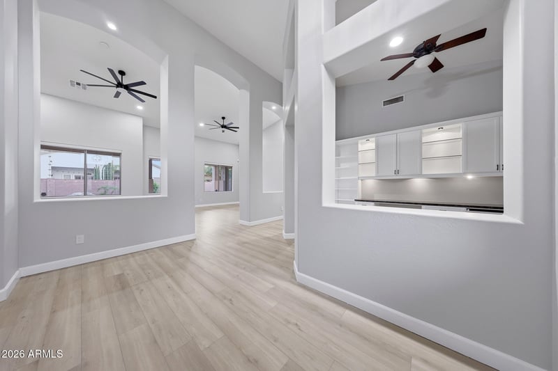 Listing details for 1091 Kaibab Pl, Chandler, AZ 85249 : Situated in one of Chandler's premier neighborhoods and just minutes from highly acclaimed A+ schools, this rare basement residence North East Lot presents a refined blend of thoughtful design, modern upgrades, and exceptional indoor outdoor living. The kitchen serves as the centerpiece of the home, beautifully appointed with crisp white cabinetry, quartz countertops, and a statement waterfall island, all opening seamlessly to the main living area anchored by a fireplace and overlooking the expansive backyard. The outdoor space is designed for both relaxation and entertaining, featuring a covered travertine patio, lush turf, and a pebble finish play pool with waterfall feature and built in seating. Privately positioned on its own wing, the owner's suite offers direct backyard access... and a spa inspired bath highlighted by a sleek walk in shower with rainfall head, body jets, and handheld fixture. A well appointed home office with custom cabinetry is located near the entry, while 2 additional bedrooms and a fully remodeled bathroom are thoughtfully set on the opposite side of the home. The basement level introduces a generous flex space curated for versatility, offering endless possibilities for a private theater, game lounge, fitness studio, or multi generational living, accompanied by 2 additional bedrooms and a beautifully updated bathroom. Elevated by soaring ceilings and luxury vinyl plank flooring throughout, the home is completed by a 3 car garage with epoxy flooring and built in storage. A rare offering that delivers both sophistication and functionality, ready for immediate enjoyment.
