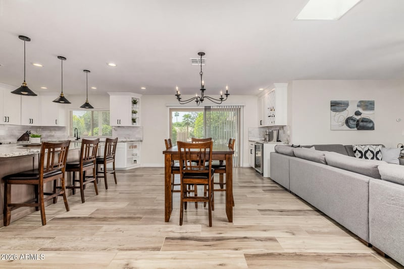 The updated kitchen features a large island, built-in beverage bar, updated lighting, and stylish finishes, while large plank tile flooring provides durability and LOW-MAINTENANCE living throughout. The home includes two beautiful custom tile walk-in showers, along with a shower/tub combination in the guest bath.