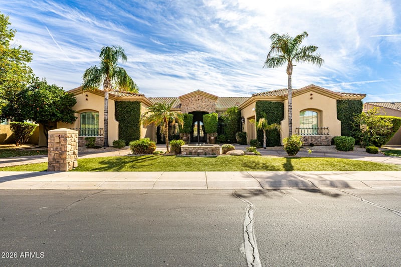 Listing details for 10919 Onyx Ct, Scottsdale, AZ 85259 : A great value in gated Monteloma! This highly upgraded, light-filled home offers a 4BD/4BA floor plan with office, formal living and dining, family room, media room, and oversized game/bonus room with stone fireplace. Warm brick accents highlight the breakfast area and primary suite. Tile flooring with the look of hand-scraped hardwood adds character throughout. Gourmet kitchen features extensive storage, gas cooktop, double ovens, KitchenAid appliances, wine cellar, and breakfast bar. Private primary suite with luxurious his-and-hers bath. Low-maintenance, English-inspired yard with gardens, fruit trees, pool, covered patio, outdoor kitchen, firepit, and grassy area. Side yards offer iron arbor, 2 hidden storage, and flexible space for recreation. A must see!