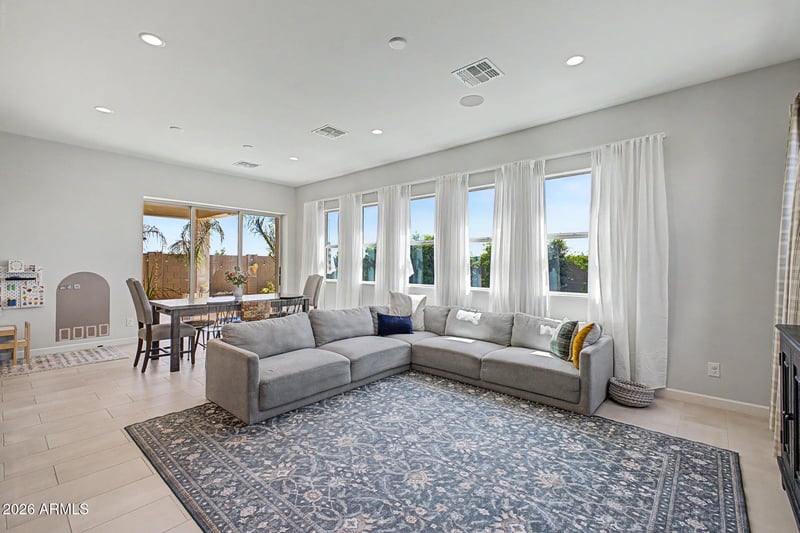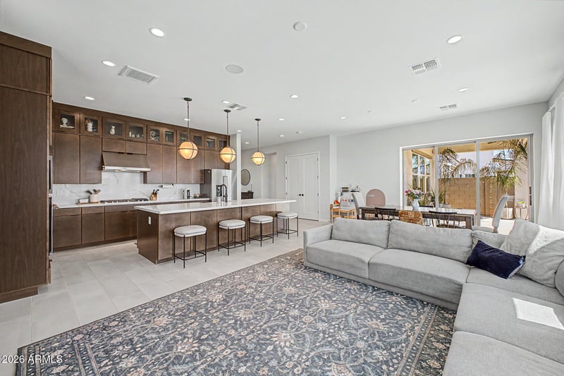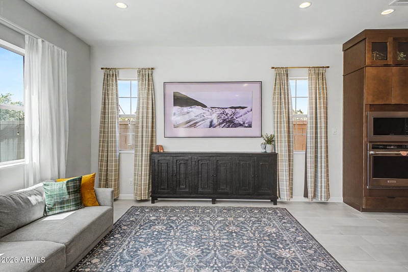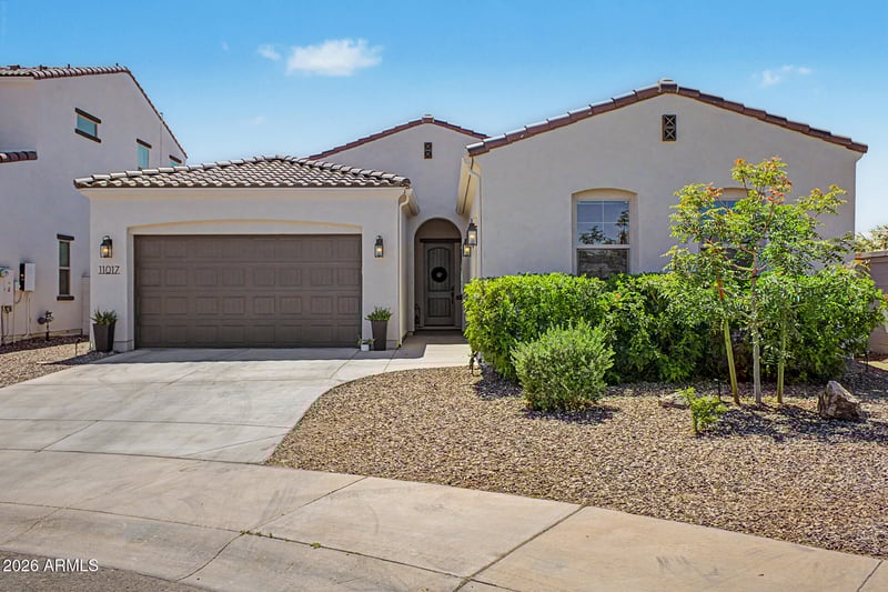 Listing details for 11017 Ulysses Ave, Mesa, AZ 85212 : Welcome to Tapestry! This highly upgraded home sits on a greenbelt corner lot with beautiful sunset views, surrounded by trees and foliage. Sliding door that disappears into the wall leading to a full travertine patio. Turf, mature trees etc. Home audio system indoor/outdoor. 10' ceilings. Smooth wall texture and tile throughout main living area. Home fully equipped with dimmable recessed lighting and designer light fixtures. Gourmet kitchen outfitted with Kitchenaid appliances, quartz countertops and backsplash. Stacked maple cabinets. Roll out cabinet drawers. Expanded island with extra storage cabinet space. Cast iron farmhouse sink. Meticulously cared for and turn key.