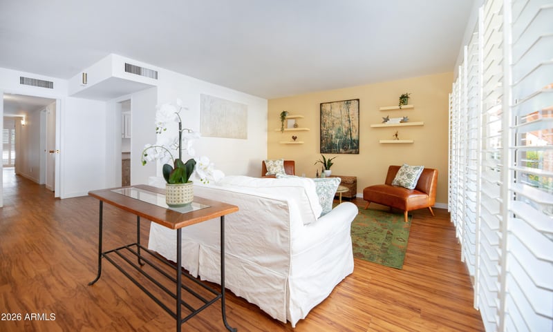 Listing details for 111 Palm Ln #A, Phoenix, AZ 85004 : Beautifully updated and maintained in a mid-century complex nestled in the heart of the City surrounded by restaurants and museums!The spacious great room features a wall of windows with terrific natural light,art wall space and custom lighting. The kitchen has been updated with granite countertops and has cabinet and counter space galore! Both bedrooms have full wall closets and the primary has large arcadia doors to a private patio. Both baths have been amazinlgy maintained with vintage tile in pristine condition.The laundry has a stacked w/d unit & laundry sink.There are plantations shutters and wood like flooring t/o. Even the 1 car garage is pristine! HOA covers nearly ALL of your costs including a/c AND taxes! New air handler in unit. Incredible quality on this cash only complex.