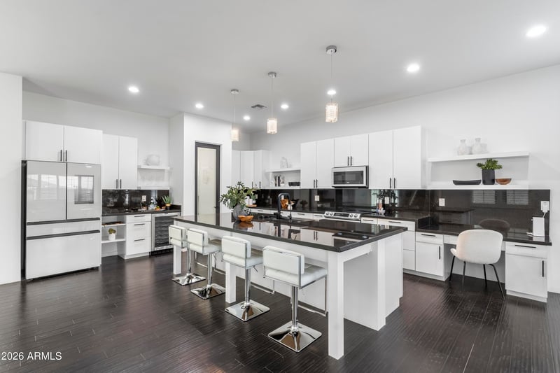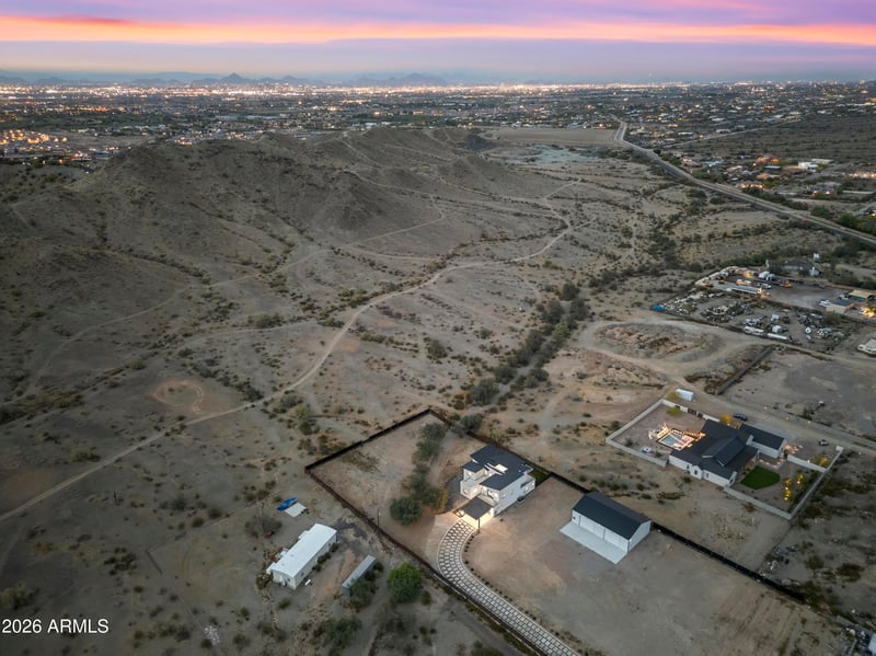 Listing details for 11209 39th Ln, Laveen, AZ 85339 : Two gated acres at the base of Carver Mountain; this is the kind of property that doesn't come up twice.Custom-built contemporary estate with 360-degree panoramic mountain views, direct trail access, and zero HOA. Deliberate architecture, high-end materials, and a design that moves effortlessly from resort-style outdoor living to elevated interior spaces. The privacy and scale of rural Arizona, just fifteen minutes from Laveen Marketplace, thirty minutes to Sky Harbor, direct 202 Loop access.Clean white stucco, bold rooflines, and a cedar-and-rock carport announce the arrival. Inside, engineered hardwood floors and gallery-white walls anchor an open great room that flows directly to the pool courtyard through multi-panel glass doors. The chef's kitchen delivers: black granite countertops, oversized island, Samsung Bespoke smart appliance package, walk-in pantry, and full-height granite backsplash. Main-floor suite with private laundry and pool access handles guests or multigenerational living. Dedicated office with full bath completes the main level. Upstairs: a versatile loft + large view deck, 2 ensuite bedrooms with full tile baths + custom walk-in closets, and a spa-caliber owner's suite with direct access to a private rooftop deck with a jetted hot tub, unobstructed mountain and desert views, & nothing beyond but open sky. Below, the heated pool and spa courtyard sit framed by the home itself with Estrella mountains as the backdrop. Detached 60x40 engineer-certified garage built for RVs, equipment, or a serious workshop. EV charger in place. Built tight throughout: 6.5" blown cellulose insulation, dual-pane low-E windows, Ultra Performance Hybrid Shutters, whole-house water softener, and Energy Star systems.