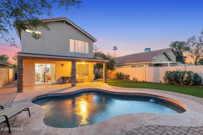 Listing details for 11413 32nd Way, Phoenix, AZ 85028 : Beautiful North Phoenix home ideally situated across from a park in the sought-after Summer Lane community. This prime lot offers desirable north/south exposure and is just minutes from the newly revitalized PV Mall area, featuring an exciting mix of trendy shopping, dining, and entertainment. Convenient access to the Loop 51 freeway makes commuting a breeze. This well-maintained home features 3 bedrooms, 2.5 bathrooms, and a spacious, versatile floorplan with a second living area and an upstairs loft--perfect for a home office, media room, or play space. Major updates include a new roof (2026), AC system (2022), and pool pump (2024), offering peace of mind for years to come. Step inside to soaring vaulted ceilings and an abundance of natural light, creating an open and inviting atmosphere. The updated kitchen boasts newer appliances, granite countertops, and overlooks the backyard, ideal for both everyday living and entertaining. Enjoy your own private outdoor retreat with a sparkling PebbleTec pool, covered patio, low-maintenance artificial turf, and built-in grill, perfect for Arizona living year-round.
