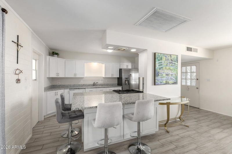 Listing details for 11467 Desert Hills Dr, Sun City, AZ 85351 : This beautifully updated and fully furnished 2-bedroom, 2-bath home is move-in ready and packed with upgrades! The stylish kitchen features granite countertops, a wrap-around breakfast bar, updated cabinetry and hardware, stainless steel appliances, and durable plank tile flooring that flows seamlessly throughout the home.