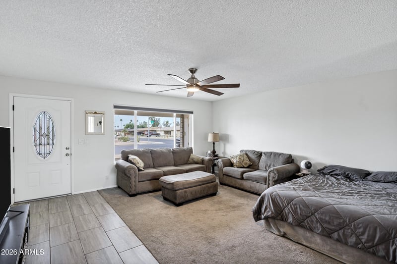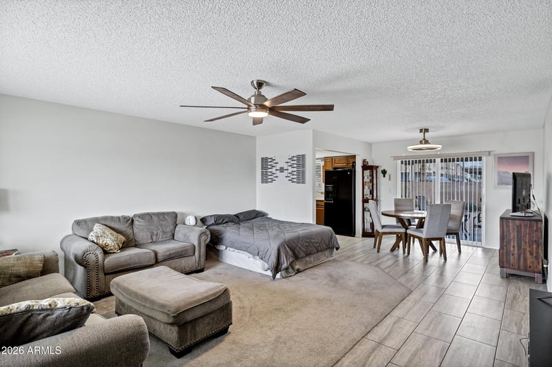 The open living and dining areas flow together nicely, creating a functional layout for everyday living and entertaining. The kitchen features warm wood cabinetry and built-in appliances, offering both convenience and practicality. Step outside to the covered back porch, an ideal place to relax and enjoy Arizona's outdoor living year-round.
