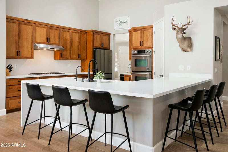 Listing details for 11628 Starflower Dr, Chandler, AZ 85249 : The perfect home does exist! A single story, recently updated home, on 1/2 acre+ lot, perfectly situated in one of south Chandler's premier neighborhoods. Popular floor plan offers 3,844sf with 5 bedrooms and 3.5 bathrooms. Owners removed walls to open the space up and create multiple living/entertaining spaces. Separate guest wing with en-suite bathroom plus three large secondary bedrooms and a MASSIVE owners suite. Wood look tile t/o, beautiful fireplace in the great room, and freshly painted walls. Kitchen features light oak cabinetry, quartz counters, double ovens, gas cooktop, and a large bartop with seating. Perfectly landscaped front & backyard with artificial turf and mature landscaping. Pool, pavers, and cabana are only 3 years old - nothing to do but enjoy your backyard oasis!