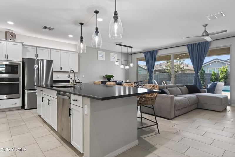 Listing details for 1166 151st Ln, Goodyear, AZ 85338 : Beautifully maintained by its original owners, this thoughtfully upgraded home offers 3 bedrooms and 2.5 baths across 1808 SqFt with an inviting open great room layout. The gourmet kitchen showcases shaker-style cabinetry, granite counters, stainless appliances, a walk-in pantry, and a large island with breakfast bar and pendant lighting. Center-meet sliding glass doors open to a fantastic backyard featuring an extended paver patio, a sparkling pool with a water feature, and easy-care artificial turf ideal for kids and pets. One side yard is fully fenced, creating a perfect dog run. The primary suite includes an en-suite bath with an extended dual-sink vanity with makeup area, a separate tub and shower, and a spacious walk-in closet. Additional highlights include neutral two-tone paint throughout, plantation shutters in the bedrooms, a built-in workstation, and a 2-car garage with epoxy floors, overhead storage racks, built-in cabinets, and a convenient service door to the side yard.
