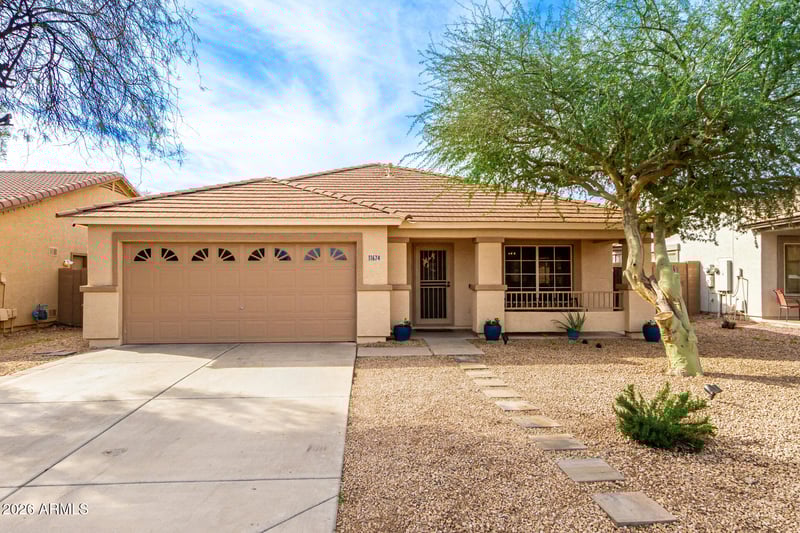 Listing details for 11674 153rd Ave, Surprise, AZ 85379 : Start creating lasting memories in this inviting single-level home! A 2-car garage welcomes you, leading into a spacious great room highlighted by vaulted ceilings and tile floors in all the right places perfect for everyday living and entertaining alike. The newly remodeled kitchen shines with stainless steel appliances, granite countertops, white cabinetry, a stylish tile backsplash, a pantry, and a breakfast bar ready for casual meals. Retreat to the serene primary suite featuring a chic bathroom with dual sinks, a NEW stand alone soaking tub, walk in shower and a large closet. Outside, the backyard offers a covered patio and plenty of room to design your dream pool oasis. This home has a NEW HVAC as well! Comfortable, stylish, and full of potential. This one truly feels like home!