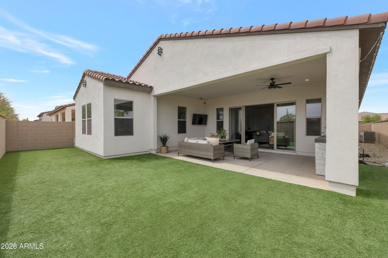 Listing details for 11709 Luckenbach St, Surprise, AZ 85388 : This Greenville 3 BR/2 BA/2 car wide garage offers gorgeous finishes & the best use of space available! Stunning kitchen featuring floor to ceiling cabinets, 5 gas burner cooktop w/hood, timeless marble countertops w/decorative stone backsplash & spacious island/eating bar for 4, GAS oven, walk in pantry w/glass door, 2 sets of stylish pendant lights & hardware to finish the look. OVERSIZED great room opens to dining & an area to possibly add a desk too! Spacious primary suite w/fresh white cabinets & classic white marble countertops, designer tile flooring, walk in shower & custom closet system. 2 more BR's share a full bath with marble. Laundry located off garage. 400 sq ft covered patio & hi value turf with cooling gel in your back yard. Welcome to Sterling Grove Golf & Country Club!