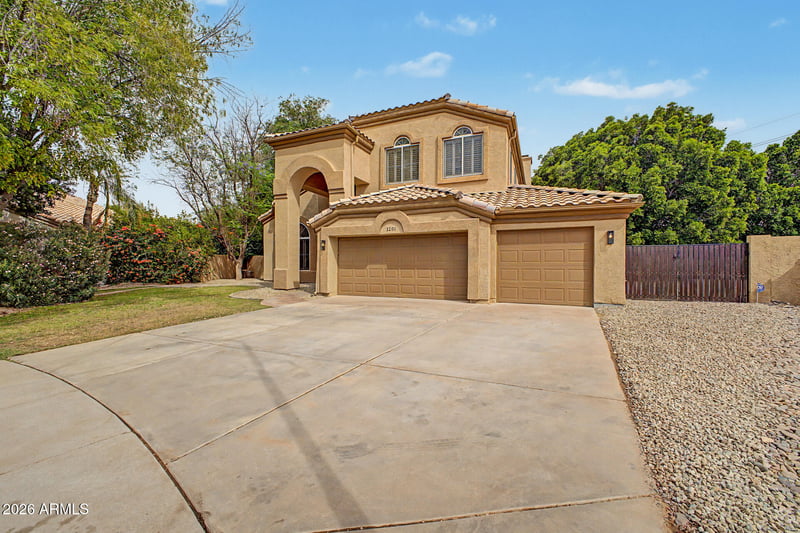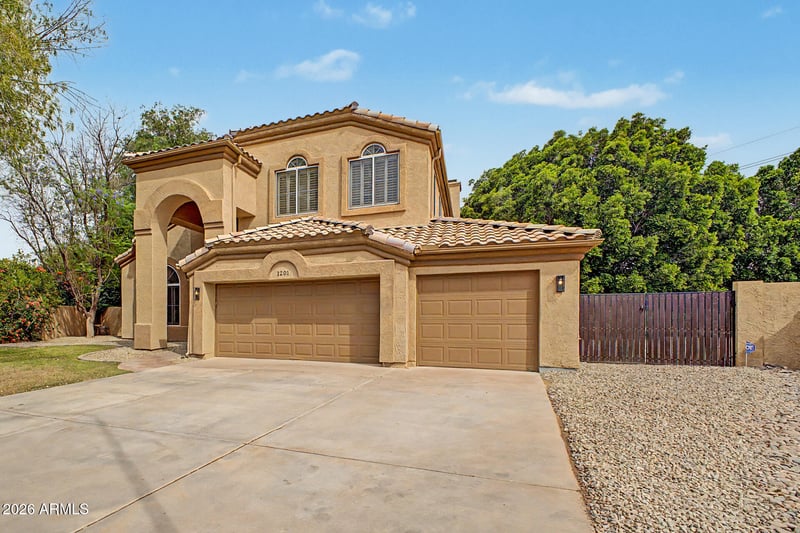 Listing details for 1201 Washington Ave, Gilbert, AZ 85233 : This fabulous two-story residence has it all, with 5 bedrooms, 3 baths + powder room, a 3-car garage & RV gates! NEW AC, NEW ROOF, ALL NEW FLOORING, and MULTI-SLIDER. Fall in love with the bright and airy layout, featuring new wood-look flooring, soaring vaulted ceilings that make it feel even more spacious, plantation shutters for a timeless charm, a fireplace to ensure cozy winter evenings, and a soothing palette that makes you want to stay. A brand new kitchen awaits your culinary adventures, equipped with plentiful storage cabinetry, tile backsplash, SS appliances, and a quartz peninsula with a breakfast bar, perfect for casual meals. Primary suite offers a bathroom with dual sinks and a separate shower & tub, plus a walk-in closet for effortless organization. Your backyard oasis is complete with a covered patio with pavers, where you can enjoy a refreshing drink, ample seating space with a serene landscape, and a sparkling pool for fun times! Truly a must-see!