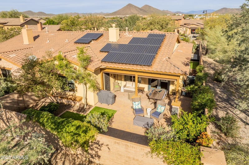 Listing details for 12065 Desert Mirage Dr, Peoria, AZ 85383 : Live the carefree life in this stunning villa located in Blackstone Country Club, north Peoria's premiere golf community. Tucked in a quiet cul-de-sac you are going to love this well cared for 2 bedroom, 2 bath plus Den and OWNED SOLAR! Serene courtyard entrance leads you to a beautiful arched entrance. Step inside and you'll find a gorgeous kitchen with rich cabinets, tile backsplash, granite countertops, stainless appliances and a perfect breakfast nook. Great room has a cozy fireplace and designated entertainment niche. Primary suite features an ensuite with soaking tub, step in shower and walk in closet. Bonus room is perfect for work or craft area and a nice den can be converted to a third bedroom as needed. Large wine cabinet in the hall will convey with the home! Lovely outdoor space with large covered patio, mature landscaping, a gorgeous tiled water feature, extensive pavers and artificial turf. This home is exactly what you have been looking for!!