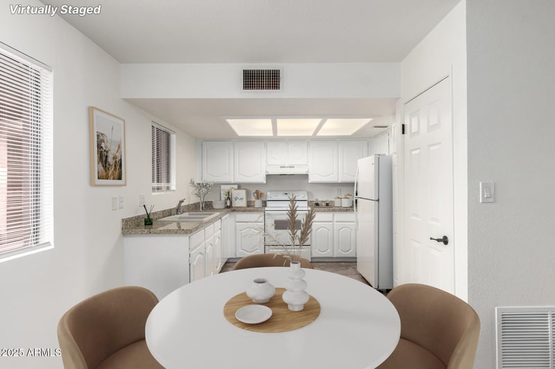 Listing details for 12222 Paradise Village Pw #212, Phoenix, AZ 85032 : Charming residence in the highly sought-after Paradise Valley neighborhood! This 2nd story condo boasts a spacious open design with neutral paint, ceiling fans, tile flooring in traffic areas, and carpet in the right places. The living room provides an inviting & functional space for both relaxing & entertaining. The impeccable white kitchen features abundant storage, granite countertops, and matching appliances. The bedroom has doors to the balcony, a walk-in closet, and a bathroom with a granite vanity sink. The well-sized balcony includes a laundry closet and an exquisite view of the community pool. Anasazi Village Condominiums offers common BBQ areas, assigned parking, and spa. Excellent location! Surrounded by markets, restaurants, and entertainment. What's not to like? Act now!