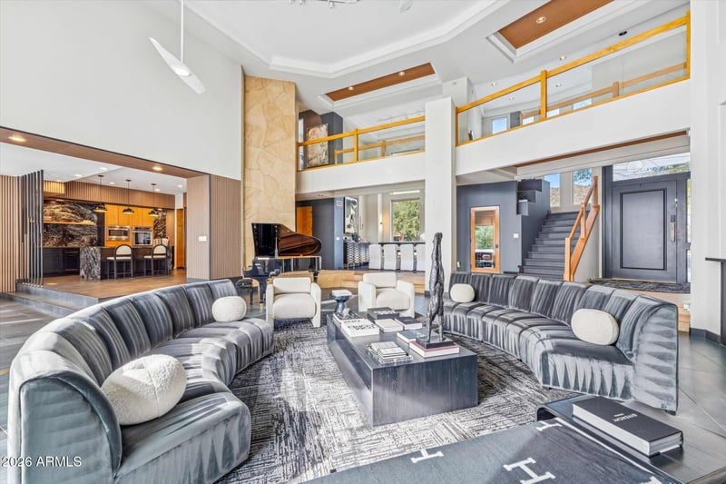 Listing details for 12233 Running Bear Ct, Phoenix, AZ 85044 : Completely reimagined in 2025, this meticuloulsly updated Ahwatukee Custom estate sits on a quiet cul-de-sac with beautiful mountain views. Upon entry you are greeted by a spacious great room with 22' ceilings and 2 fireplaces. The formal dining has striking windows form floor to ceiling. Beautiful open modern contemporary design with amazing special touches throughout like high end Phillipp Plein designer wallpaper. Vey functional Kitchen with huge walk-in pantry and extra cabinets. All bedrooms have their own private bath and balcony. Huge game room and the backyard is an entertainers dream with 2 pools, a spa, and a sport court. Add to that a BBQ and 2 fire pits and you are sure to enjoy those Arizona nights!