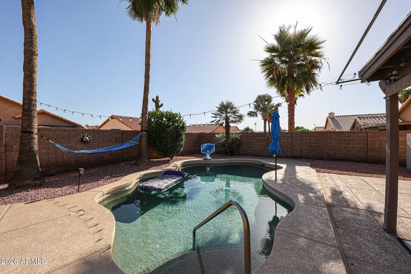 Listing details for 12237 Cambridge Ave, Avondale, AZ 85392 : Absolutely stunning Rancho Santa Fe home with upgrades where it counts! This 4-bedroom, 2 bath home features a beautifully remodeled bathroom with a custom tile shower and upgraded fixtures for a true spa-like feel. The elegant kitchen shines with quartz countertops, upgraded fixtures, and a large island perfect for entertaining. Open, functional floor plan with great living space. New roof installed 2026. Step outside to your private backyard oasis with a heated pool -perfect year-round, pavers and mature fruit trees. 2 car garage and generous lot complete this move-in ready home!