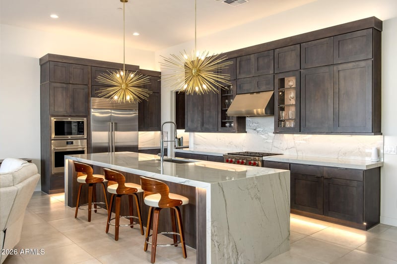 Listing details for 12418 Troon Vista Dr, Scottsdale, AZ 85255 : Enclave at Sereno Canyon offers luxury lock-and-leave living in North Scottsdale, framed by mesmerizing mountain views throughout the community. This spacious Caullins model residence showcases a modern minimalist aesthetic with a soothing neutral palette, large format tile flooring, and striking designer lighting. The chef's kitchen is a showpiece, featuring rich sleek cabinetry with undermount lighting, premium stainless appliances, quartzite backsplash and quartzite waterfall island with seating - perfect for entertaining or everyday ease. A pantry is discreetly tucked within a wall of cabinetry with illuminated display spaces, blending beauty and function. In the great room, a custom built-in floating buffet extends storage while enhancing the clean-lined design and defining a relaxed, inviting living space. Oversized sliding doors open to serene outdoor living on the spacious covered patio, complete with a built-in barbeque, putting green and modern "floating" firepit - your own private retreat. Just minutes from the Clubhouse, enjoy Sereno Canyon's resort-style lifestyle with the private Mountain Lodge, offering exceptional resident amenities including dining, a fitness center, pool, spa and guest lodging. Come experience the convenient, elevated North Scottsdale lifestyle you've been looking for.