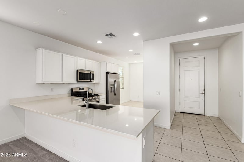 Listing details for 12608 Kaler Dr, Glendale, AZ 85307 : Beautiful single-story home now available in Marbella Ranch. This well-maintained property offers excellent curb appeal, manicured front yard, and a 2‑car garage. Inside, the home features a functional floor plan with carpet in the main living areas, tile flooring in high‑traffic spaces, recessed lighting, abundant natural light, and neutral interior paint that suits any style. The kitchen includes white cabinetry, a solid‑surface peninsula with seating, and stainless steel appliances. The spacious primary bedroom includes a walk in closet and private ensuite bathroom with dual sinks. The backyard is designed for easy outdoor living, complete with a covered patio, paver accents, and low‑maintenance artificial turf perfect for relaxing or entertaining. Don't miss thi