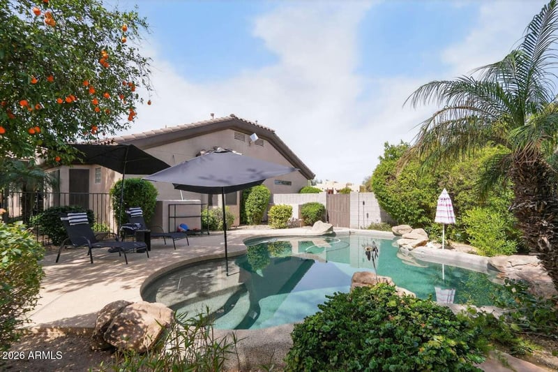 The kitchen is designed for both function and style, showcasing a peninsula breakfast bar, stainless steel appliances, and double ovens. The primary suite offers a private exterior entry and a luxurious ensuite bath complete with dual sinks, a jetted soaking tub, snail shower, and an expansive walk-in closet. Step outside to your own private oasis. The beautifully landscaped backyard boasts a large covered patio, outdoor kitchen with Blackstone grill, built-in BBQ, gas firepit, and mature trees, including mature - citrus creating a serene and secluded setting. The inviting PebbleTec pool with a waterfall feature adds the perfect finishing touch to this entertainer's dream yard.