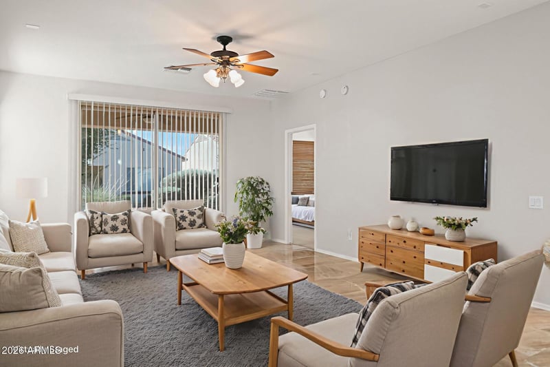 Listing details for 12947 Chapala Dr, Sun City West, AZ 85375 : 2-bedroom home in the prestigious guard-gated community of Corte Bella Country Club. This desirable split-bedroom floor plan offers an open-concept design, seamlessly connecting the living room, dining, and kitchen--ideal for both everyday living and entertaining. The kitchen is equipped with newer stainless-steel appliances, an induction cooktop, & the added flexibility of an optional gas hookup. The spacious primary suite features dual sinks, a walk-in shower, & a generous walk-in closet, creating a comfortable private retreat. Enjoy resort-style living in Corte Bella, an active adult community known for its exceptional amenities, including a clubhouse, heated pool & spa, tennis and pickleball courts, on-site restaurant, lots of scenic walking paths, and a vibrant calendar of activities.
