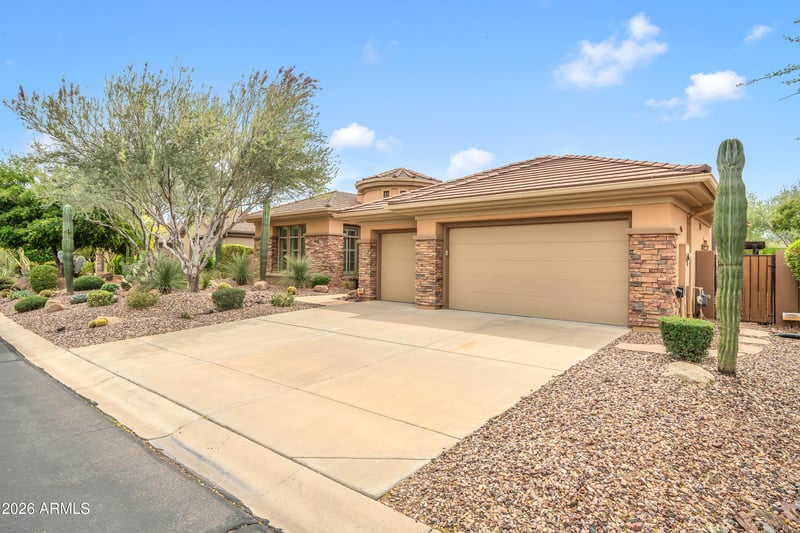 Listing details for 1303 Spirit Dr, Anthem, AZ 85086 : Experience the pinnacle of desert luxury in this stunning estate located at the private prestige Anthem Golf and Country Club, where breathtaking mountain views and golden sunsets become your daily backdrop. The heart of the home is a true chef's kitchen, featuring expansive granite countertops, premium stainless steel appliances including a built-in wall oven and microwave, and a massive center island with seating that flows effortlessly into the living spaces. The interior is defined by sophisticated architectural details, showcased in the sprawling great room with its soaring ceilings, stacked-stone fireplace, and custom integrated cabinetry.