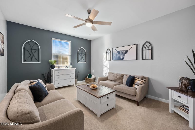 Listing details for 13188 Redstone Dr, Peoria, AZ 85383 : Peaceful Peoria home now available! Beautifully upgraded property backing to a community greenbelt/park with mountain views! Enjoy an open-concept layout featuring a bright white kitchen with stainless appliances, designer tile backsplash, oversized island with breakfast bar, & stylish pendant lighting. Spacious great room & dining area flow perfectly for entertaining. Upstairs loft adds flexible space for a media room, office, or playroom. Relax in the stunning owner's suite with cozy fireplace & custom accent wall with electric fireplace, plus a spa-like bath with dual sinks & an extended vanity. Step outside to your private backyard oasis with sparkling pool, turf, paver patio, & room to lounge or host. Prime 85383 location! Come & see!
