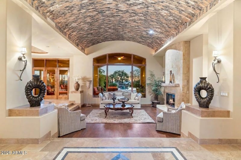 Listing details for 13249 Summit Dr, Scottsdale, AZ 85259 : Stunning and private single-level Italian retreat with every bell and whistle you can imagine. Positioned so the entire backyard captures a southwest-facing panorama, the home showcases jaw-dropping Camelback Mountain views, glowing sunsets, and sparkling city lights. This custom estate offers over 6,000 sq ft of pure Mediterranean-inspired luxury. Step through the grand entry and into a space that feels like a boutique Mediterranean resort, defined by a dramatic barrel-vaulted brick ceiling, rich textures, and timeless architectural symmetry. Old World craftsmanship is felt in every detail; hand-laid stonework, intricate flooring inlays, warm plaster walls, and the sculptural floor-to-ceiling hearth anchoring your first impression. Dining room's custom Marano chandelier, brought in from Italy, conveys with the home. The flowing layout includes formal and casual gathering spaces, a chef's kitchen, and multiple entertainment zones, all designed to frame the iconic view. Five en-suite bedrooms, including a private guest wing, deliver exceptional comfort and privacy. Five and a half bathrooms echo the home's villa-like ambiance with stone finishes and refined European styling. Outside, the home transforms into a resort-style haven, sparkling infinity pool and spa, multiple loggias, fire features, and uninterrupted southwest-facing Arizona views that feel cinematic from sunrise to dusk. Grand yet intimate. Textural yet refined. A true Old World masterpiece in the heart of Scottsdale. Rancho Trinadad is a quiet 32-home gated community known for its privacy, dramatic views, and proximity to Sunrise and Lost Dog Trailheads, Mayo Clinic Scottsdale, top-rated SUSD schools, and quick access to the 101.