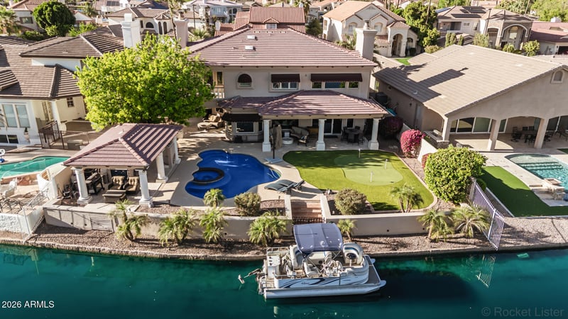 Listing details for 1325 Sandpiper Dr, Gilbert, AZ 85233 : Experience luxury waterfront living in this stunning 4-bedroom, 3-bath, 3-car garage estate located in the highly sought-after Tres Vistas at The Islands. From the moment you arrive, the home's impressive curb appeal shines with new windows, manicured landscaping and low-maintenance artificial turf. Inside, a welcoming foyer opens to elegant living and family rooms, each featuring its own fireplace, creating warm and inviting spaces perfect for relaxing or entertaining. Soaring ceilings, beautiful wood flooring, and a sophisticated designer color palette enhance the home's refined feel. A convenient downstairs bedroom and full bath provide ideal accommodations for guests. The inviting dining room, illuminated by a dazzling chandelier, provides the perfect setting for memorable gatherings. The chef-inspired kitchen is both stylish and functional, showcasing custom wood cabinetry, onyx countertops, a stone backsplash, stainless steel appliances, a walk-in pantry, and a peninsula with breakfast bar seating. The luxurious primary suite serves as a private retreat, complete with a cozy fireplace, plantation shutters, a spacious walk-in closet, and direct access to a private balcony overlooking the serene lake. The spa-inspired ensuite features dual vanities, a walk-in spa shower, and a beautiful clawfoot soaking tub. Step outside to your resort-style waterfront backyard, designed for both relaxation and entertaining. Enjoy a covered patio, charming gazebo, private putting green, and a sparkling heated and cooled pool and spa. A private dock for your boat and an outdoor bathroom complete this exceptional outdoor oasis. This extraordinary property offers the perfect blend of luxury, comfort, and waterfront lifestyle--an entertainer's dream in one of the community's most desirable locations.