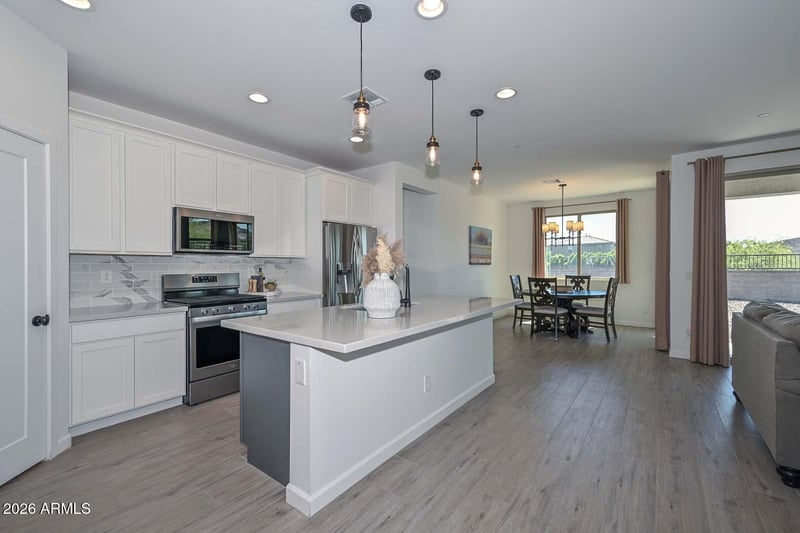 Listing details for 13255 Crestvale Dr, Peoria, AZ 85383 : Welcome to Sonoran Place in NW Peoria. Built in 2019, this well-kept 1,781 sq ft home offers a smart, open layout with 3 bedrooms plus a den, ideal for a home office, playroom, or flex space. The kitchen opens to the main living area, creating an easy flow for everyday living and entertaining. The spacious primary suite offers comfort and privacy, while the backyard is a standout with beautiful mountain views and room to relax and enjoy Arizona sunsets. Located in a desirable community near shopping, dining, parks, and freeway access, this home blends newer construction, functional space, and scenic surroundings.