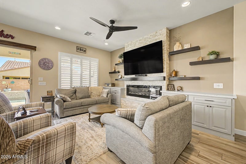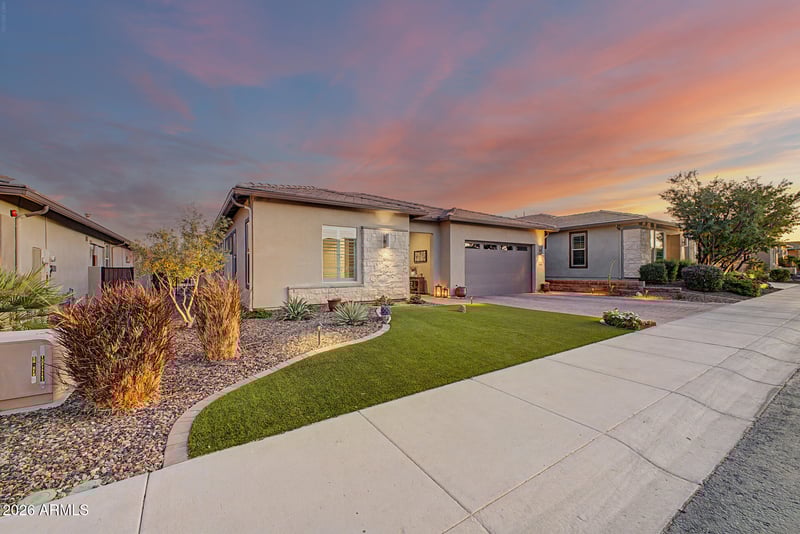 Listing details for 13309 Milton Dr, Peoria, AZ 85383 : MONTAGE FLOORPLAN AVAILABLE NOW!! Your Dream Home with Owned Solar, Private Heated Pool and SPA, and a 3 Car Tandem Garage w/AC Mini Split is finally available!! This gorgeous residence built in 2022 features a Stunning Stone facade, pristine artificial turf and a custom driveway w/pavers. It includes Two Spacious (Split) Master En Suites with Walk In Closets, all 3 Full Baths are upgraded w/ stunning tile & Quartz c-tops plus an oversized Den/Office with Double Doors. Chef's Kitchen is designed like a Model Home w/Custom Cabinetry, Quartz Countertops w/tile backsplash and a Custom Quartz Island paired w/ SS Gas Appliances, and a SS Hood Vent. The open floorplan showcases high ceilings, recessed lighting, attractive wood look flooring, and classic Plantation Shutters. The Great Room includes a15 ft. Slider that brings the outside in!! It has an exquisite Custom Built Travertine TV/Entertainment Center that includes a 68" Heated Fireplace, Wood mantel, floating shelves, built in Base cabinets with Quartz Countertops. Enjoy gorgeous sunsets in the Resort Style Backyard, complete w/ a covered patio, a warm fire pit for starlit evenings, a built-in BBQ, & a refreshing spa & pool. Top rated resort community for your active lifestyle, Trilogy has it all. Golf, restaurants, TWO club houses, pools and activities galore. This superb home is an entertainer's dream with amazing upgrades and outdoor living.