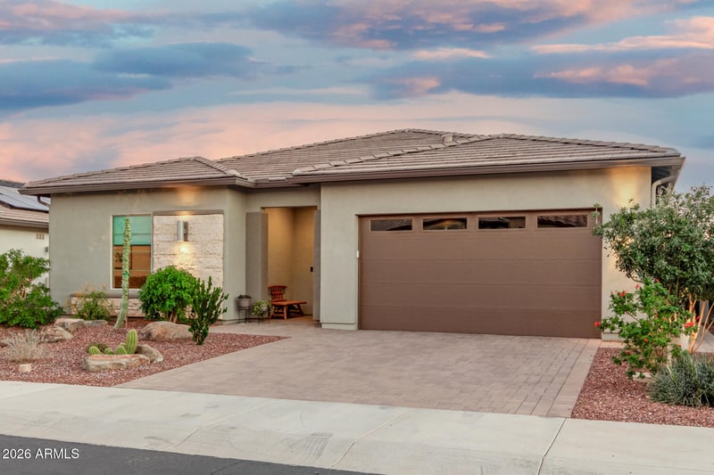 Listing details for 13365 Domino Dr, Peoria, AZ 85383 : This is the private desert oasis you have been looking for! This stunning Montage floorplan features 3 bedrooms, a den and 3 full baths! Upon entry through the custom front door, you will be delighted by the gorgeous herringbone pattern solid wood flooring throughout. This home features dual suites making it perfect for guests and roommates! The chef's kitchen with natural quartz countertop will wow you and your guests. After whipping up a delightful spread, grab a cocktail from the custom bar and exit the multi-slider patio door to take a dip in the heated pool and spa. Grab a cold drink from the outdoor wine fridge and a sizzling steak from the custom built in BBQ to round out the evening with al fresco dining. Located in the award winning active adult community Trilogy at Vistancia this home has EVERYTHING your heart desires! Golf and 2 resort style clubhouses with numerous amenities including Pickleball courts, tennis courts, indoor and outdoor swimming pools, 2 state of the art fitness centers, billiards, ballroom, bocce ball clubs and classes for all interests! Relax at Trilogy's Alvea spa offering massages, facials, nails and salon and Zen garden! Close to 303 freeway, dining, shopping, Lake Pleasant, and Paloma Park. Come see why everyone falls in love with Trilogy at this home! Upgrades and Refinements include: Upgraded ceiling fans/lighting and dimmers throughout, soft close cabinets, window coverings, custom built bar, under cabinet and toe kick lighting in kitchen, bar and bathrooms. Mini-split cool/heat in garage, built in storage racks in garage, extended length garage, water softener, reverse osmosis, bidet, cabinets above ensuite toilets. Outdoor pergola above spa and built in BBQ island. Travertine decking and patio, artificial turf and privacy screening. Salt water lap pool and spa with fountain. Citrus trees and desert contemporary landscaping!