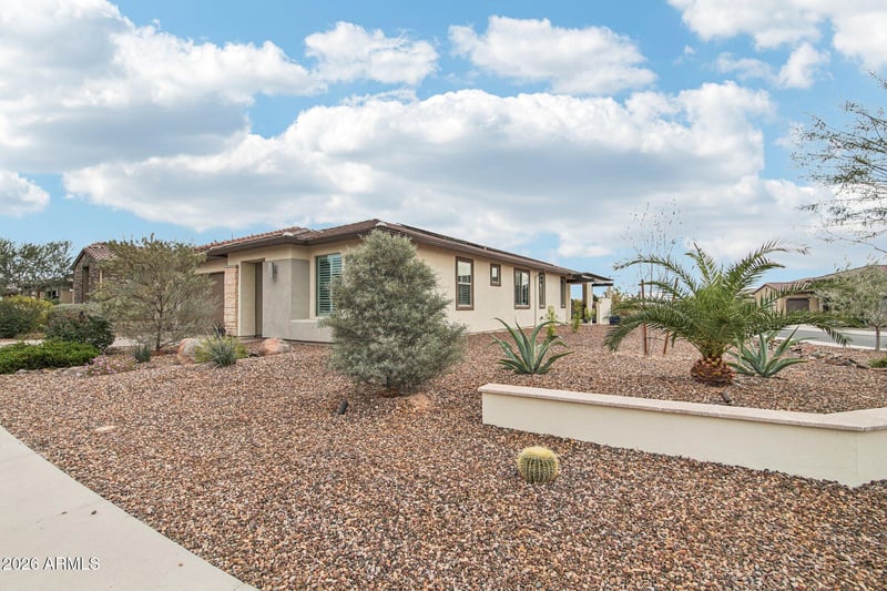 Listing details for 13385 Milton Dr, Peoria, AZ 85383 : Mosaic model featuring 2 bedrooms, 2 bathrooms, and a dedicated office/den in Trilogy at Vistancia, a 55+ active adult community. Built in 2022 and offering 1,926 sq ft, this single-story home is located on an oversized corner lot and includes owned solar. Interior features include wood shutters throughout, an automatic blind at the sliding glass door, quartz countertops, stainless steel appliances, and built-in cabinetry in the laundry room with desk and wine storage. The extended garage includes built-in cabinets, overhead storage racks, and a mini split system. The backyard features a pergola, firepit, and in-ground Sonos speaker system.
