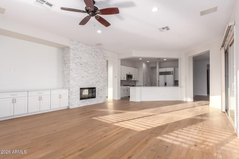 Listing details for 13403 Cabrillo Dr, Sun City West, AZ 85375 : Step into a home that feels instantly calm and beautifully renewed. A custom tile and hardwood entry opens to warm, continuous hardwood floors and thoughtfully updated spaces. The redesigned kitchen offers new cabinetry, modern countertops, stainless appliances, and soft under‑cabinet lighting. The family room features a custom entertainment center and updated fireplace, while the front office provides a bright workspace. Guests enjoy two refreshed bedrooms and a remodeled bath. The primary suite is a true retreat with hardwood flooring, a spacious walk‑in closet, and a spa‑inspired bath with a new walk‑in shower and elegant finishes.