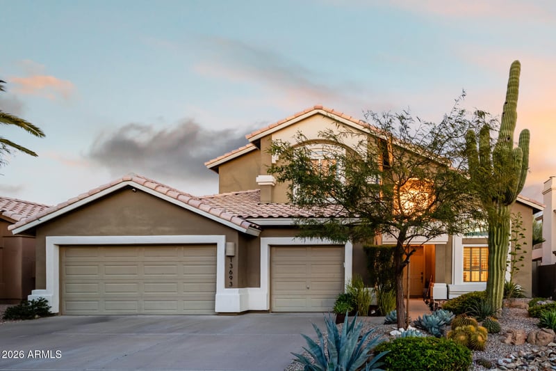 Listing details for 13693 93rd Way, Scottsdale, AZ 85260 : Hurry! Discover incredible curb appeal, energy efficiency, & privacy with no neighbors behind! A 3-car garage makes it perfect for your cars. The solar panels add long-term savings & modern convenience. A welcoming foyer, plantation shutters, soaring vaulted ceilings, & beautiful pendant lighting elevate the interior. The large living/dining room is perfect for entertaining, while the cozy family room w/dry bar is ideal for relaxed evenings. Eat-in kitchen has white cabinetry, SS appliances, granite counters, pantry, breakfast bar island, built-in desk, & sunny bay window in breakfast nook. Upstairs, double doors open to the main retreat featuring private balcony access & spa-like ensuite. Serene backyard includes lovely pavers, a built-in BBQ, covered patio, & artificial turf. Must see!