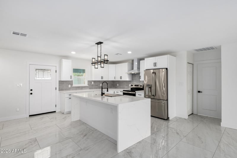 Listing details for 13802 33rd Ave, Phoenix, AZ 85053 : Move into this fabulous single-story home that has been tastefully upgraded! Nestled on a desirable corner lot, it features a 2-car garage and RV gate. Enter through double doors to a spacious open floor plan with tile flooring, recessed lighting, and fresh soft paint throughout. The pristine kitchen offers white cabinets, subway tile backsplash, stainless steel appliances, quartz counters, and a waterfall island with breakfast bar. The primary suite includes a barn door to the ensuite with dual sinks and a floor-to-ceiling tiled shower. Relax under the covered patio or enjoy the swimming pool, recently fully replastered. Home also features a new electrical panel, updated windows and no HOA. Don't miss this opportunity!