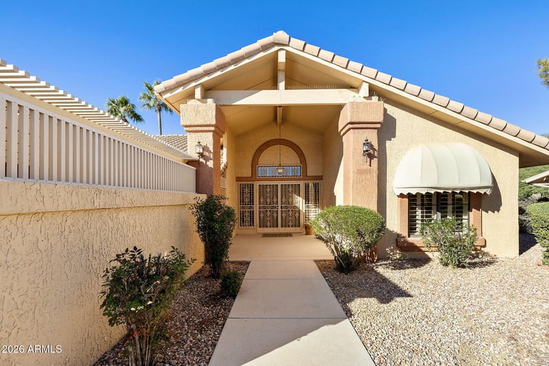 Listing details for 13826 Casa Linda Dr, Sun City West, AZ 85375 : Tucked into the heart of Sun City West, this gracious 55+ community favorite offers comfort, space, and endless potential. This home is ready for your imagination and personal touch. The desirable San Simeon floor plan—one of the largest in Phase II of the Del Webb series—provides over 2,500 square feet of living space on an expansive 13,000+ square-foot lot, perfectly designed for relaxed living and entertaining. A welcoming grand double-door entry opens to soaring ceilings and elegant formal living and dining areas, creating an impressive yet comfortable first impression. Two generously sized guest bedrooms and a full bath are thoughtfully separated from the private primary suite, offering ideal space for visitors or hobbies. The oversized primary retreat features a walk-in closet and a private sliding door that opens to a peaceful courtyardyour own quiet escape. The kitchen includes a breakfast counter, sunny breakfast nook, Arizona Room, flowing seamlessly to an enclosed back patio and beautifully maintained backyard. Added features in bk yard are roll-down security shades, charming pathways, and a side-yard patio perfect for morning coffee or evening relaxation. Additional highlights include an oversized laundry and hobby room with abundant cabinetry, a two-car garage plus a golf cart garage, and extra storage throughout.