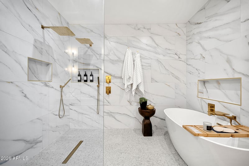 The primary suite is a private retreat, highlighted by a spa-level bathroom featuring a massive wet room, floor-to-ceiling tile, dual showers, and a freestanding soaking tub that feels straight out of a luxury resort. The experience continues into the custom California Closet, outfitted with floor-to-ceiling built-ins that maximize storage without compromising design.