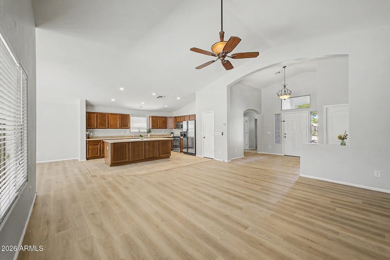 Listing details for 1401 Debbie Dr, San Tan Valley, AZ 85140 : Don't miss out on this amazing, rare split open floor plan w/4 bedrooms!!! This home nestled on a beautifully maintained street. Fall in love with the captivating great room with soaring vaulted ceilings, a soothing palette, blinds, and updated wood-look flooring. Cook delicious meals in the well-appointed kitchen, equipped with ample wood cabinetry, recessed lighting, stainless steel appliances, a walk-in pantry, and a large island with a breakfast bar for casual meals. The primary bedroom showcases an ensuite with double sinks and a walk-in closet for an organized wardrobe. Imagine enchanting moments with loved ones in the charming backyard, complete with a large covered patio and a warm fire pit for evenings under the stars. This home is close to school, parks, restaurants & shopping!