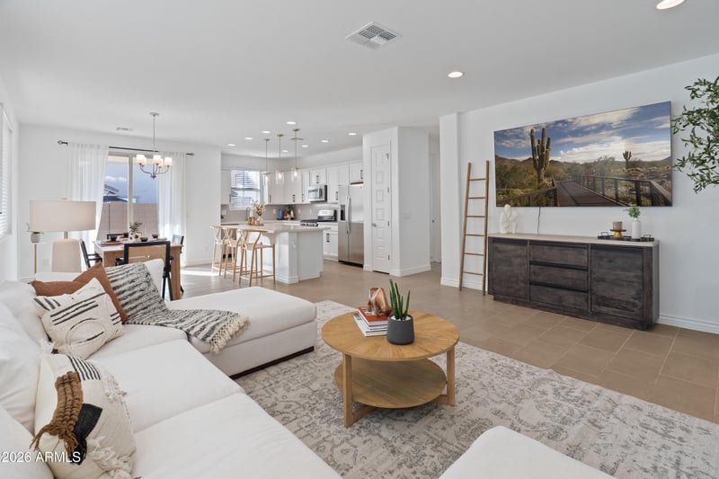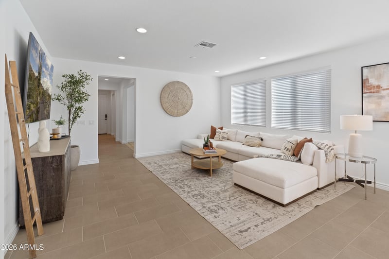 Listing details for 14229 Cottontail Ln, Surprise, AZ 85387 : Built in 2023 and truly like new, this beautifully upgraded home in Rancho Mercado offers a bright, open layout with tall ceilings and thoughtfully selected finishes throughout. Featuring 3 bedrooms plus a flex space, the floor plan is both functional and flexible for today's lifestyle.The living areas are finished with upgraded 12'' x 24'' tile flooring, while the bedrooms offer comfortable carpeting. The kitchen is the heart of the home, showcasing 36'' white cabinets with crown molding, GE stainless steel appliances, a large island with bar-style seating, and seamless flow into the main living space—perfect for entertaining. The split primary suite provides privacy and comfort with a spacious walk-in shower, dual-sink vanity, linen closet, and a generous walk-in closet. Additional highlights include a water softener and abundant natural light throughout. Step outside to a low-maintenance backyard featuring artificial turf and an extended paver patio, ideal for relaxing or hosting guests while enjoying mountain views. Conveniently located close to shopping, dining, and everyday amenities, this move-in-ready home delivers modern style and comfort in one of Surprise's most desirable communities.