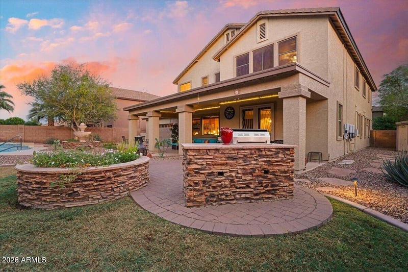 Listing details for 14338 Laurel Ln, Surprise, AZ 85379 : Welcome to a home that truly checks all the boxes--space, flexibility, and a location that's hard to beat. Situated on a premium corner lot directly across from a neighborhood park in the gated Mountain Gate community, this home is designed to adapt to the way you live. With a newer roof, updated HVAC, and paid solar, you'll enjoy peace of mind and energy efficiency from day one. With a highly functional layout ideal for multigenerational living, the main level features a bedroom and full bathroom--perfect for guests, extended family, or a private home office setup. Upstairs, you'll find the spacious primary suite along with three additional bedrooms and a large flex space that could easily be tailored into a fifth bedroom, media room, game room, or second living area. The primary suite is a true retreat, complete with a cozy gas fireplace separating the bedroom and sitting area, a walk-through closet, and a well-appointed bath featuring dual sink stations, a soaking tub, and separate shower. Tucked just behind the kitchen and accessed through the butler's pantry, you'll find a versatile bonus space--ideal for a craft room, office, or additional flex space that keeps everything organized yet out of sight. Step outside to an entertainer's backyard designed for Arizona living--featuring a sparkling pool with water features, built-in BBQ, oversized covered patio, and a large lot with plenty of space to gather, relax, and enjoy. One of the standout features is the impressive 4-car garage, complete with a pass-through door to the backyard and exceptional space for storage, hobbies, or all your toys. Located just minutes from schools, shopping, dining, and with convenient access to Loop 303, this home offers easy connectivity to everything the West Valley has to offer. Move-in ready with space for everyone--this home delivers the flexibility, functionality, and lifestyle today's buyers are looking for.